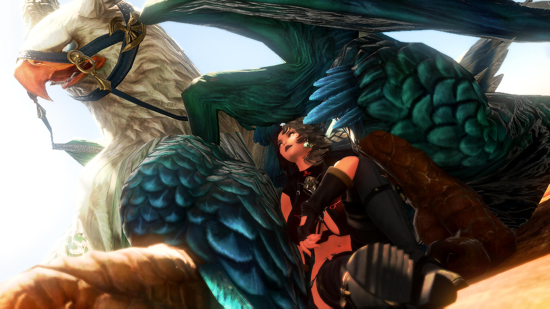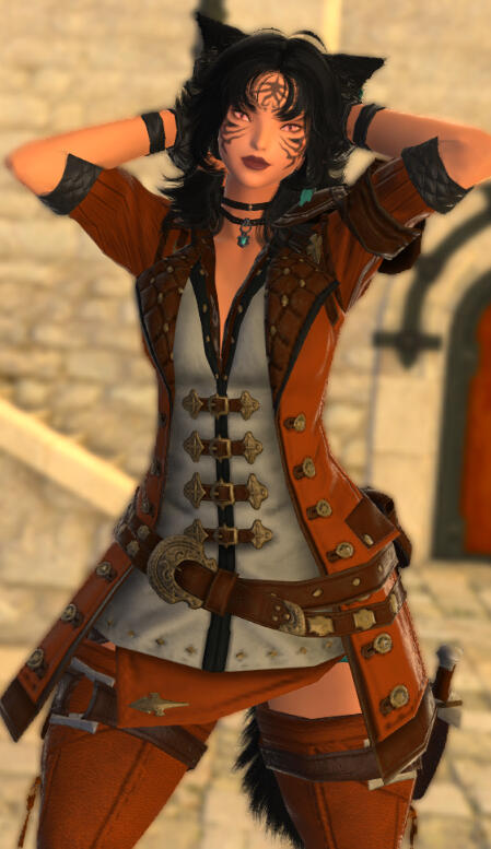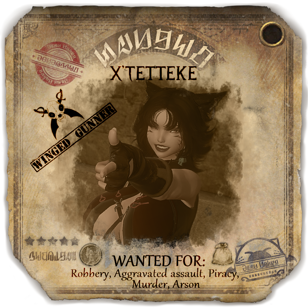 The life of the nomadic tribes of the deserts were rough but together they made it work and lived as a family. Most did at least and all families have their dramas. This one let it go too far. A self proclaimed hunting accident would take care of a bloodline. At least they thought it would till the newborn was found in a tent. They were monster hunters but couldn't kill an innocent baby, but no one wanted to fully care for it.So this little black haired Mi'qote became the community child, being passed around like a hot potato till she could fend for herself. Living in a desert was no easy task and was easier as a group, so the wild hearted adventurous youth stayed with the tribe and did her best to become accepted. She was a skilled archer starting early and was quick on her feet.Thinking of new ways to be more resourceful, the young 10 year old Tetteke slipped a rather large egg from a caravan of merchants after hearing them talk about an exotic bird like beast called a Griffin. Raising the hatchling by herself she waited till she could fly on it before introducing it to the tribe. She named him Zyran and from the moment they flew together they were inseparable. Her wild thrill seeking made her the first and only flier of the tribe. From the sky she was able to be way more effective in killing the beasts of the desert and the perfect scout. The tribe often sent her to scout far ahead, over wanting to hunt with her.She didn't know why they always pushed her aside, why they never truly accepted her. They told her, her parents died in a hunting accident. It was feasible to her, they hunted the great ruthless beasts of the desert to survive and not everyone did. She never paid attention to the hushed whispers, always thought if she could be enough for them that she would actually be accepted instead of pushed away. She had lived most her life this way, till civilization began poking into the desert. The tribe was allowed to interact as long as they did not mate with the outsiders. This was when Tetteke slowly began to realize she could be desired. Her voluptuous curves drew many of an outsider's eye. One even caught her eye, or at least what he was packing did. A gun, something her tribe never had the coin for or the training in, this man had one and was willing to teach her.Greatly interested in the weapon she would slip out and start spending a great deal of time with the outsider, learning everything she could about the weapon. He was defected soldier from a land very far away, he had fled during the gruesome war, a Garlean. He was looking for a place to claim a new home and try to forget the atrocities his hands did for his country. He thought surely his people wouldn't reach this far and he would be safe.He enjoyed teaching the curious feline everything he could, even treated her and her Griffin to things from his home. Being an excellent archer translated well to becoming a marksman and the man was surprised how quickly Tetteke took to the advanced weaponry. Unfortunately for him, he began to fall for her. That wasn't something she could allow, it was a strict rule with the clan, no outsiders. He couldn't take no as an answer, he knew how her tribe treated her and he couldn't stand seeing her try so hard just for them to walk all over her and push her aside. He went to the tribe, confessed his love for her. This was the last straw to the tribe, and the final box ticked that would let them push her out.It was also the last string holding her sanity. Her mind shattered as her tribe revolted against her. No, she couldn't let this happen, they would accept her. She took up his gun and without a word put the man down, with the very weapon he taught her with, that he favored. He laid dead in a pool of his blood and the tribe still did not accept her. Heart shattered and soul broken she would show them what a great shot she had become, killing a few of them before they could charge at her. Zyran snatched her and the dead man's body up then sped off before Tetteke could take any deadly hits. In this lonely quiet flight she realized she had fallen the man and with a grieving heart would bury him in the sands. She took his gun, naming it after him, Theodorus. Her beloved favorite weapon.And so began her terror. The flying black cat and the teal Griffin. She had nothing more to lose. That night left her mind in a crumble, she was now madness. Targeting people only for the guns. Drawing them in, toying with them till they woke up with their own weapon to their skull and those sunset eyes smiling down at them, only one has survived. She would join a pirate crew, The Crimson Arcadia. She was able to take to the seas and fly all she wanted, take what she wanted, be truly free.